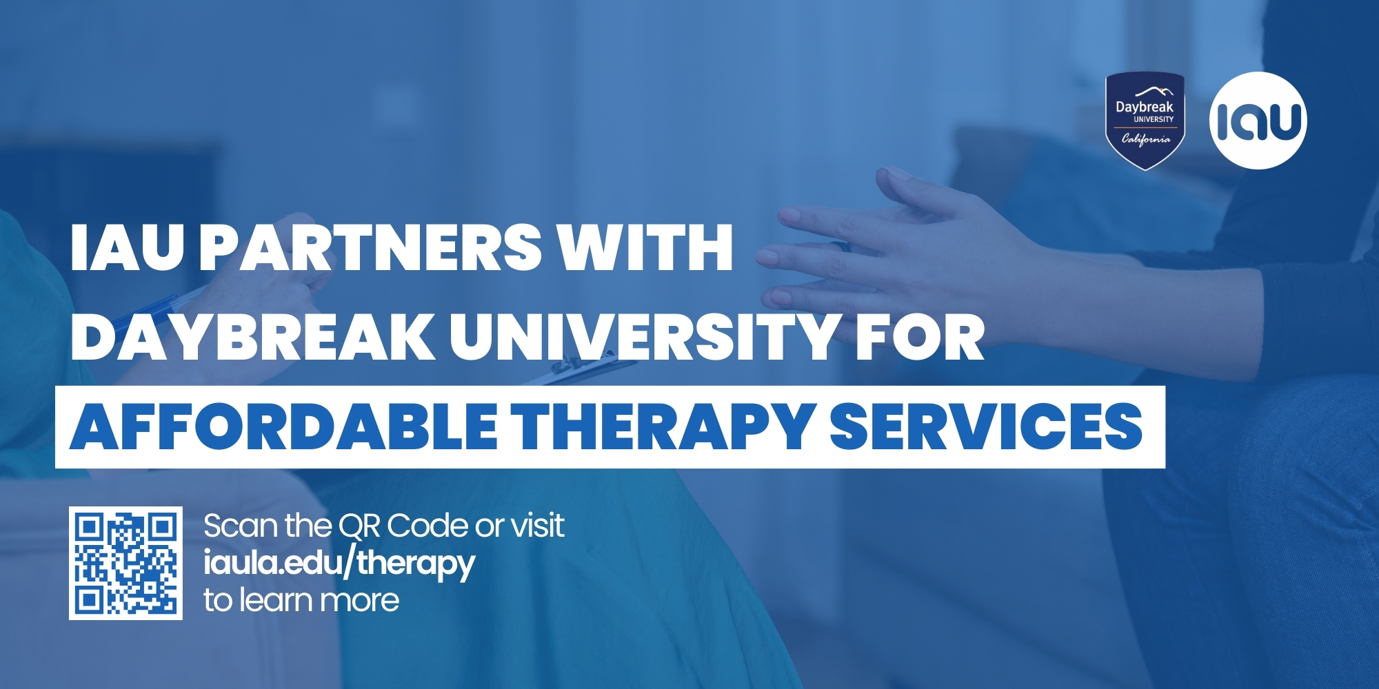IAU partners with Daybreak University Therapy Center in Anaheim to provide counseling services for students, staff, and families under licensed supervision in California.